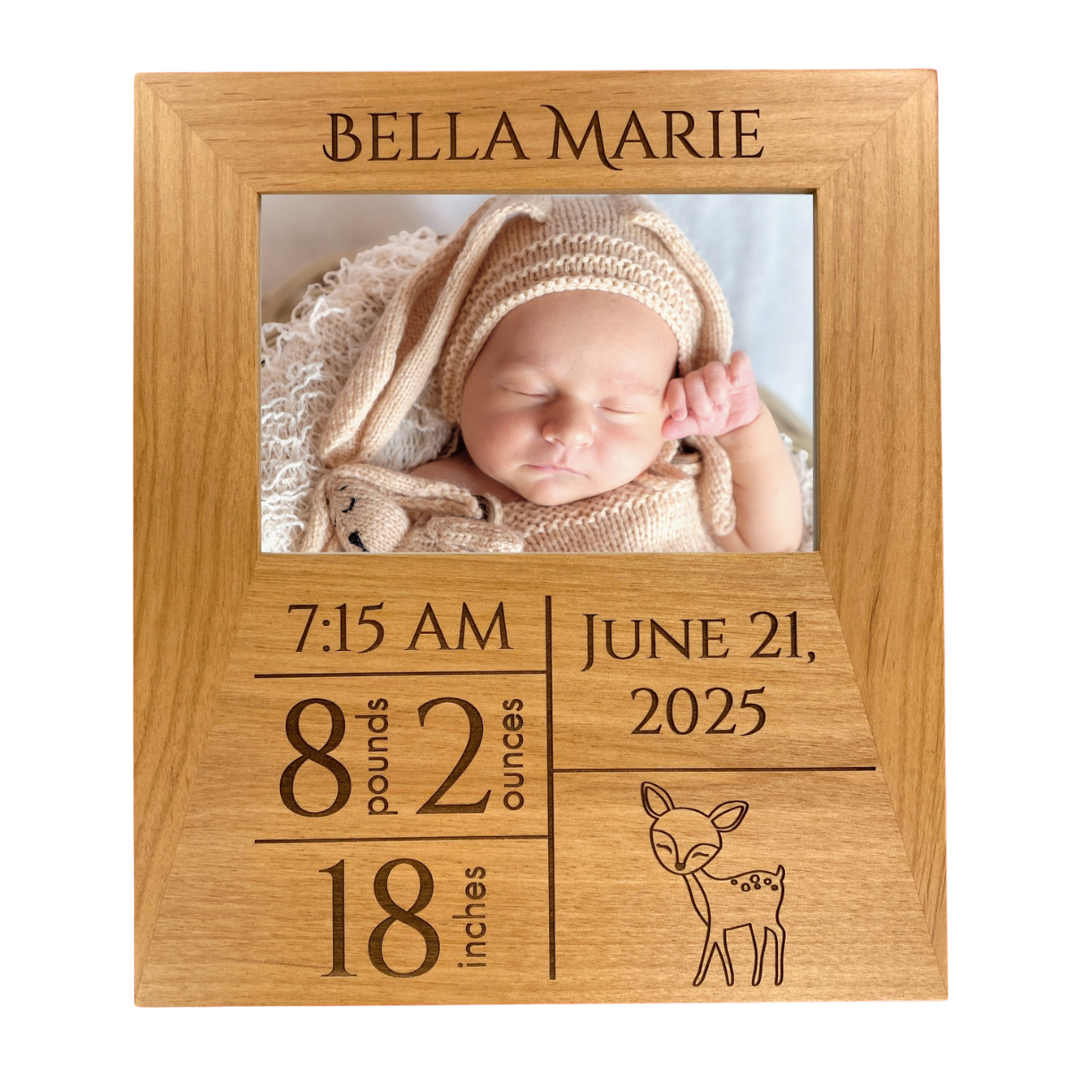 Alder wood frame with extended engraving space. Holds 4x6" photo.