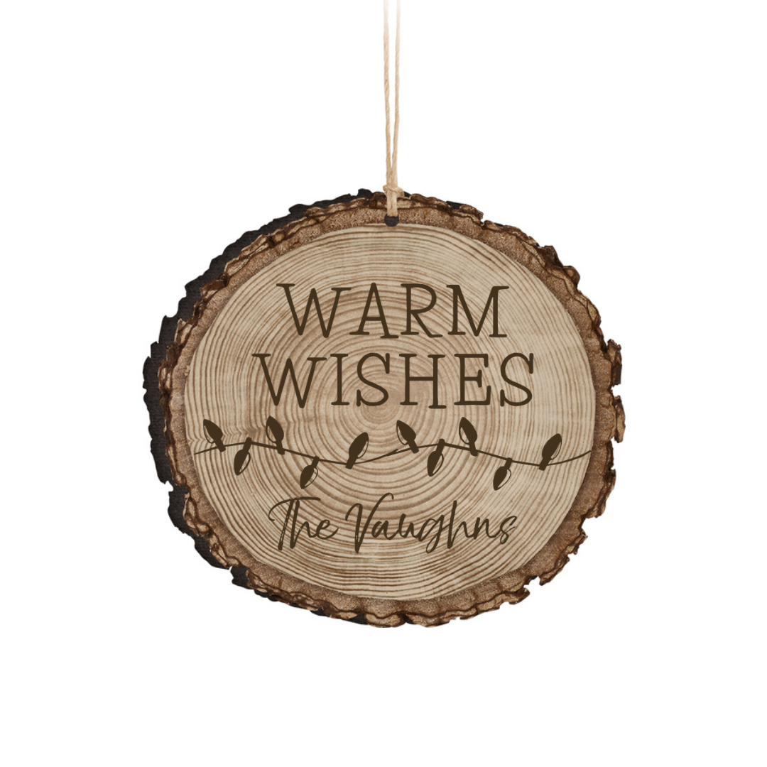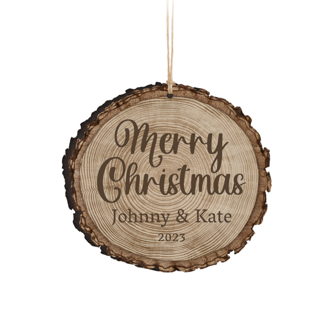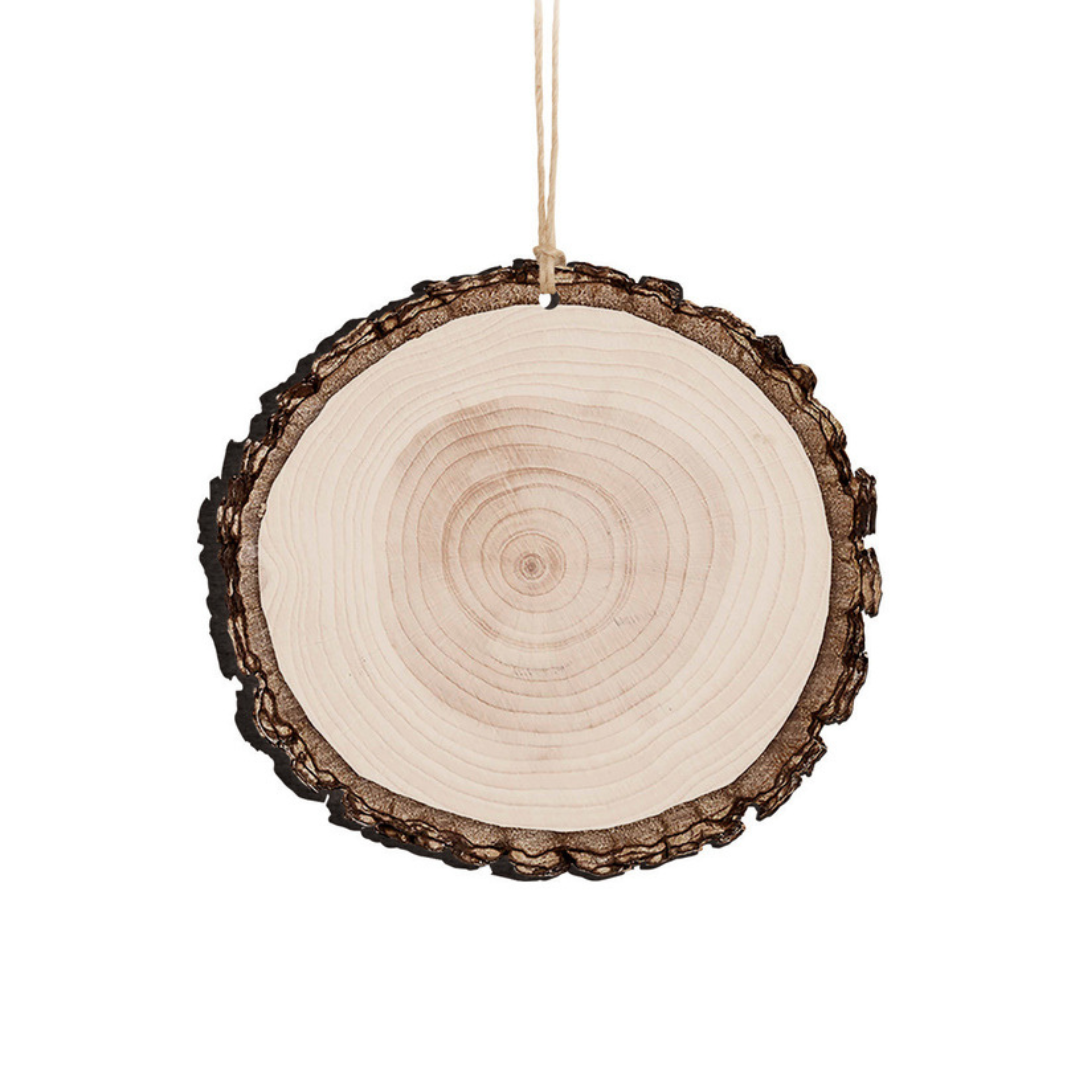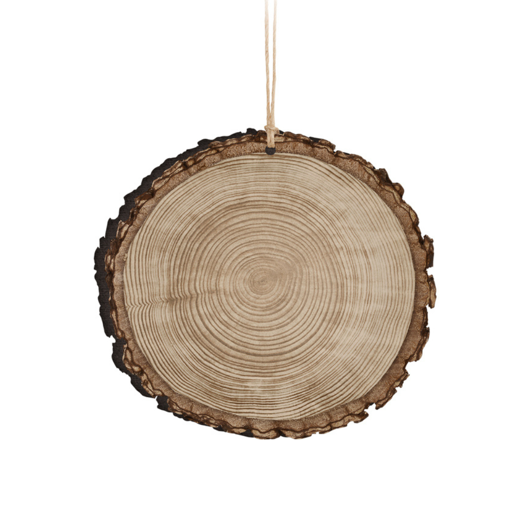 These rustic faux sliced log ornaments look like part of the tree! Custom engrave with your design of choice.