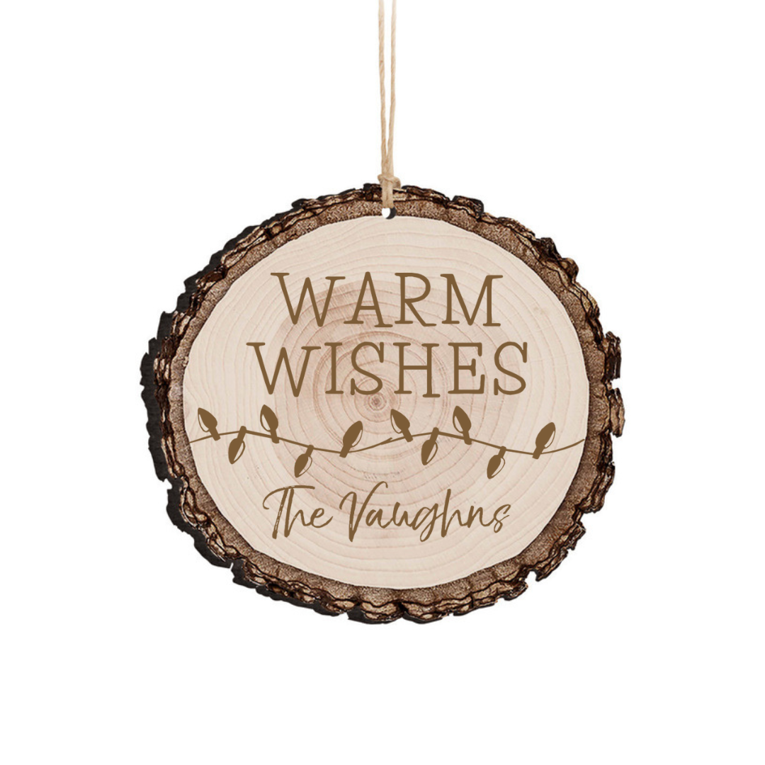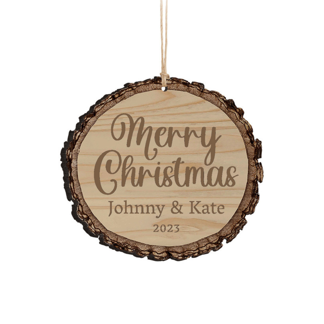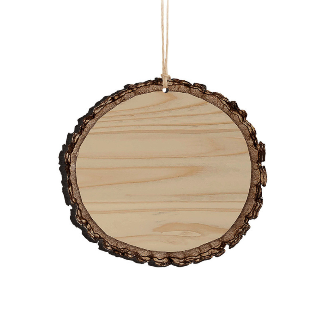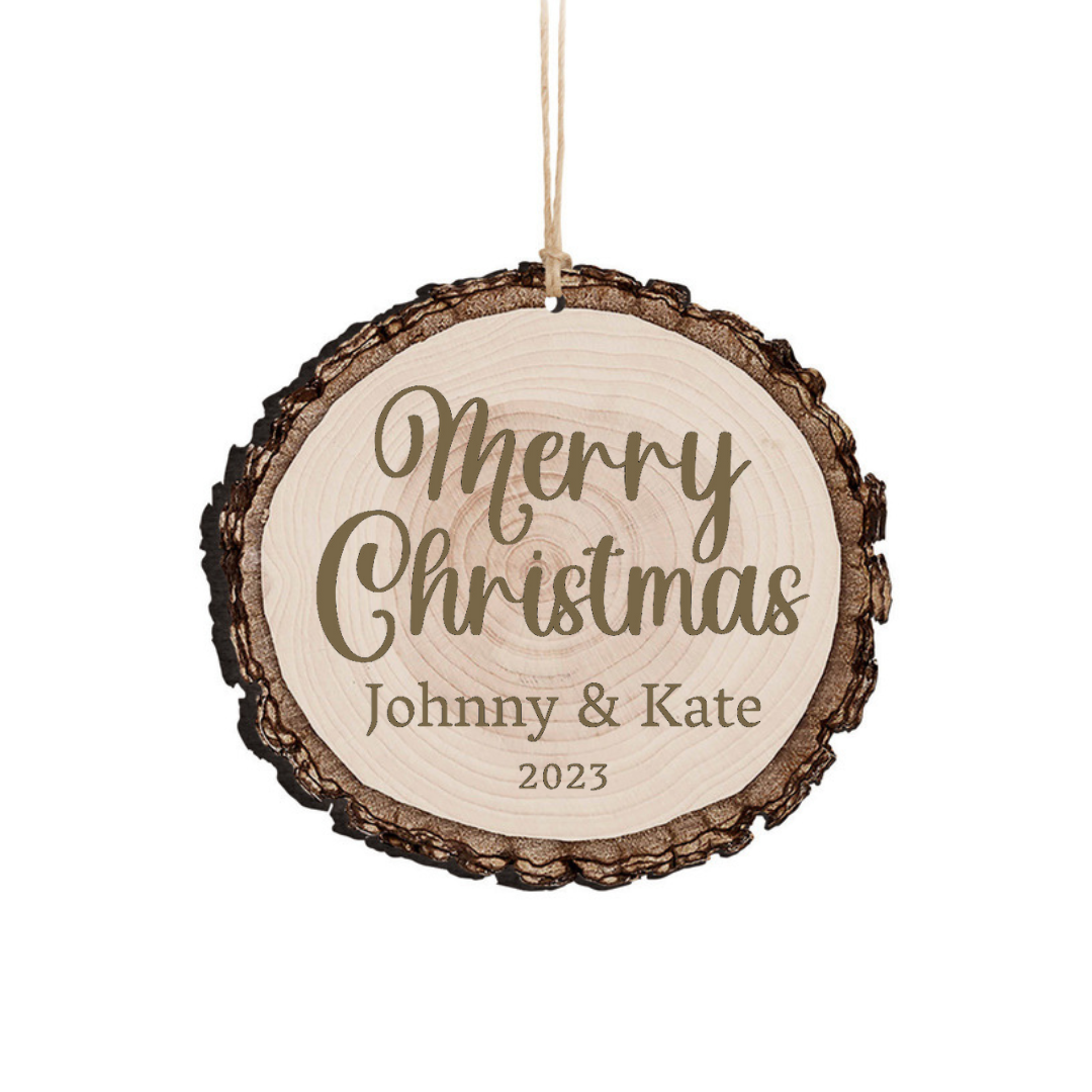 These rustic faux sliced log ornaments look like part of the tree! Custom engrave with your design of choice.