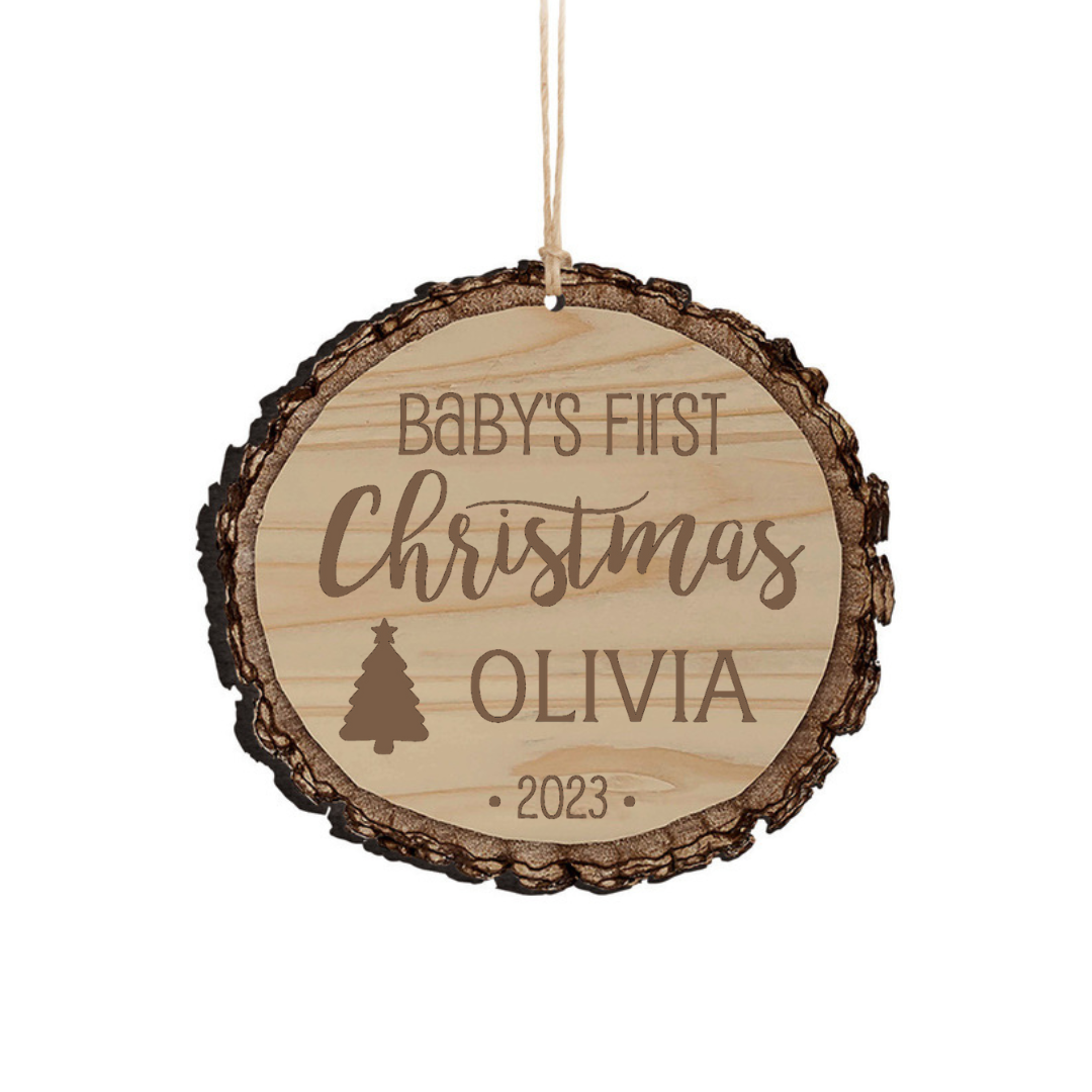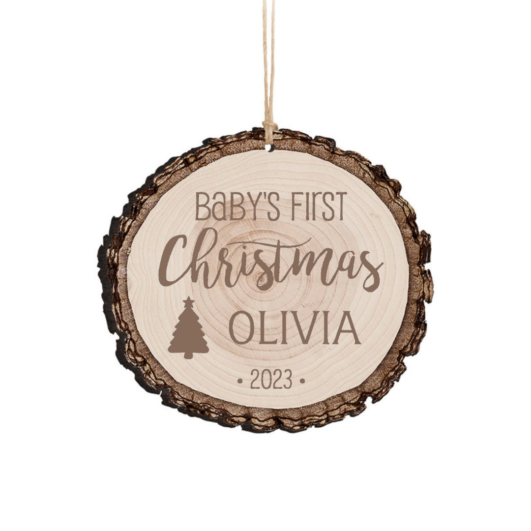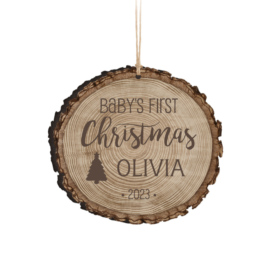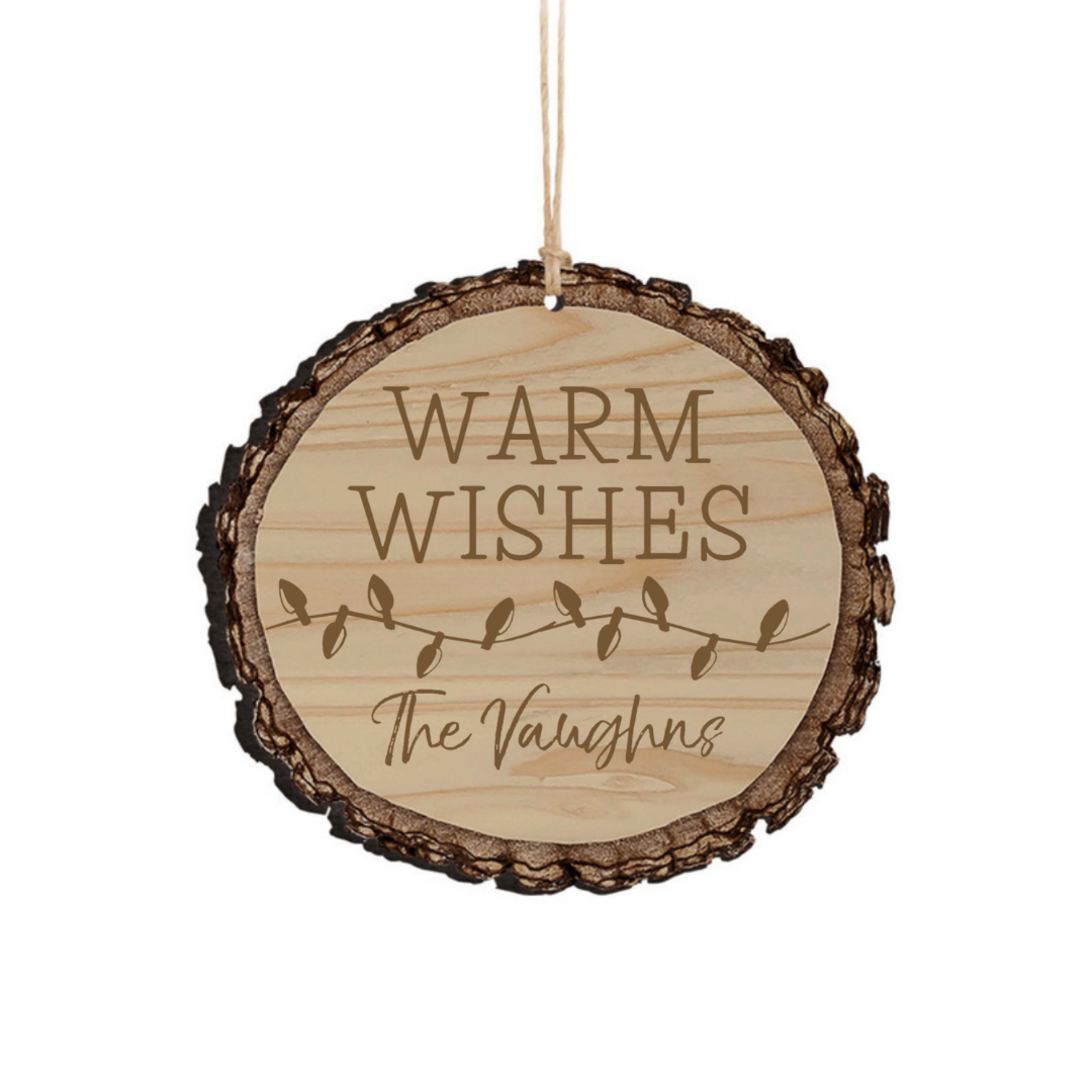 These rustic faux sliced log ornaments look like part of the tree! Custom engrave with your design of choice.