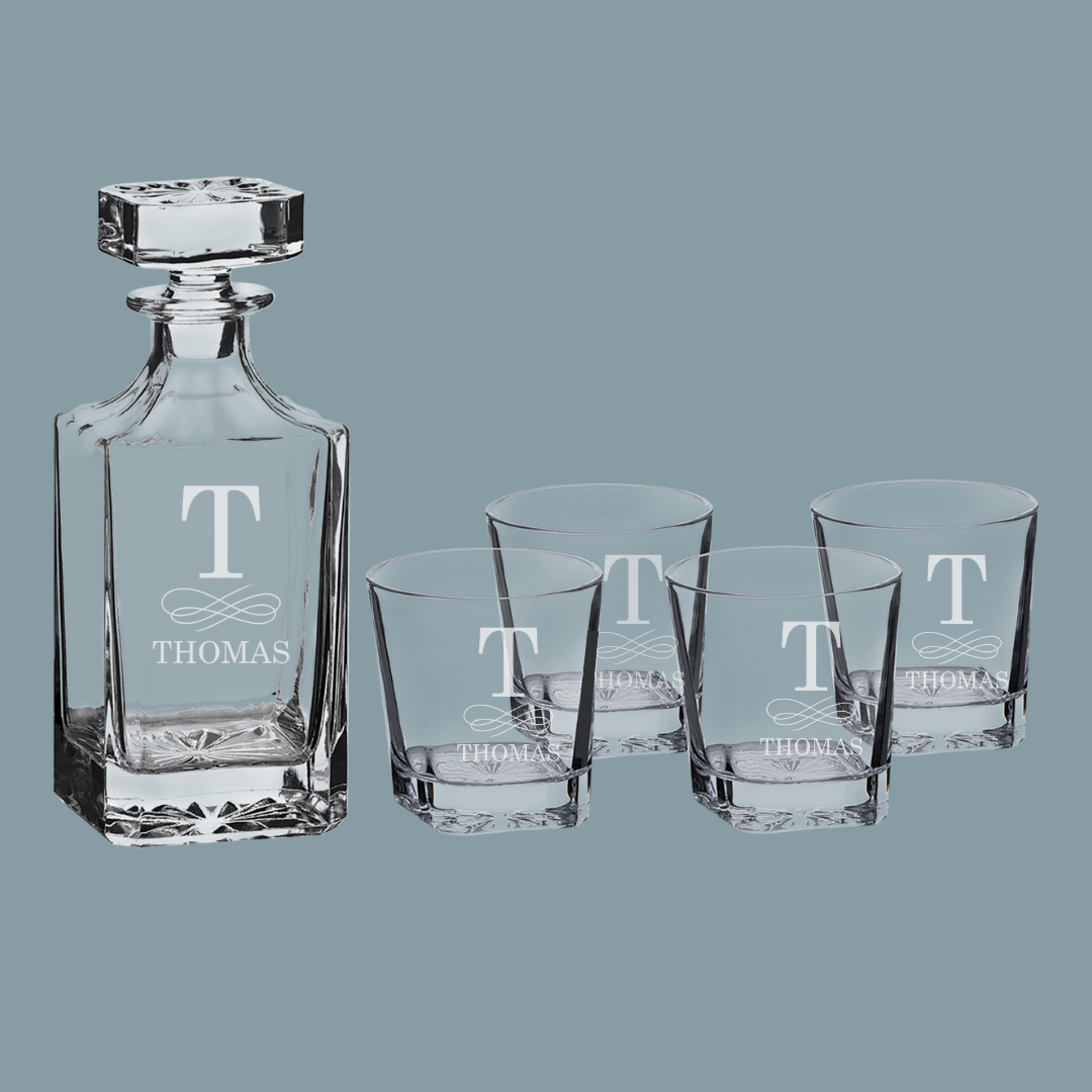 750ml Square Glass Decanter Set with Four 11 oz. Glasses and Gift Box. This beautiful gift set features a square decanter with a stopper lid and four squared 11 oz. rocks glasses. The decanter and glasses can be personalized with a monogram, logo, or other design. The set is packaged in a sturdy gift box with heavy foam for protection.