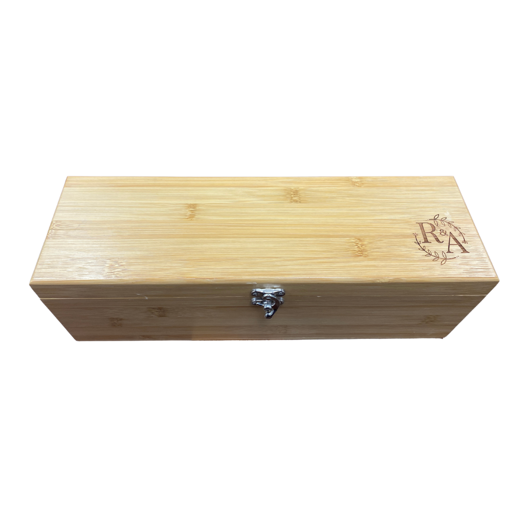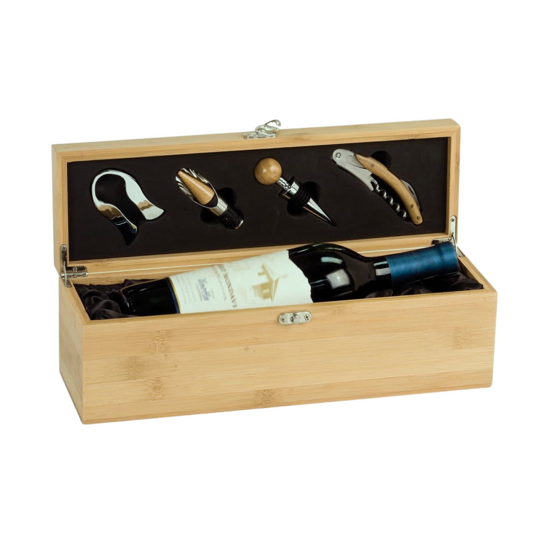 Made of solid bamboo, this presentation box holds 1 wine bottle and included is a piece to separate tools from bottle. Tools fits snugly into charcoal colored foam and include corkscrew, stopper, decanting pourer and plastic foil cutter. The box has silver hardware and clasp to hold lid tightly closed. Bottle of wine not included.